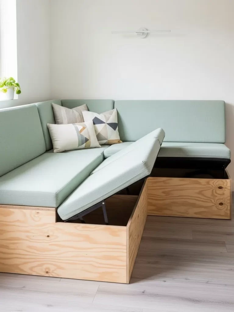 The top cushions, upholstered in a refreshing mint green fabric, lift effortlessly. This reveals deep, hidden storage compartments within the plywood boxes, making it an excellent place to stow away board games, blankets, or overflow items. This design eliminates clutter while maximizing the room’s seating capacity, proving that bespoke solutions often offer the most efficient use of space.