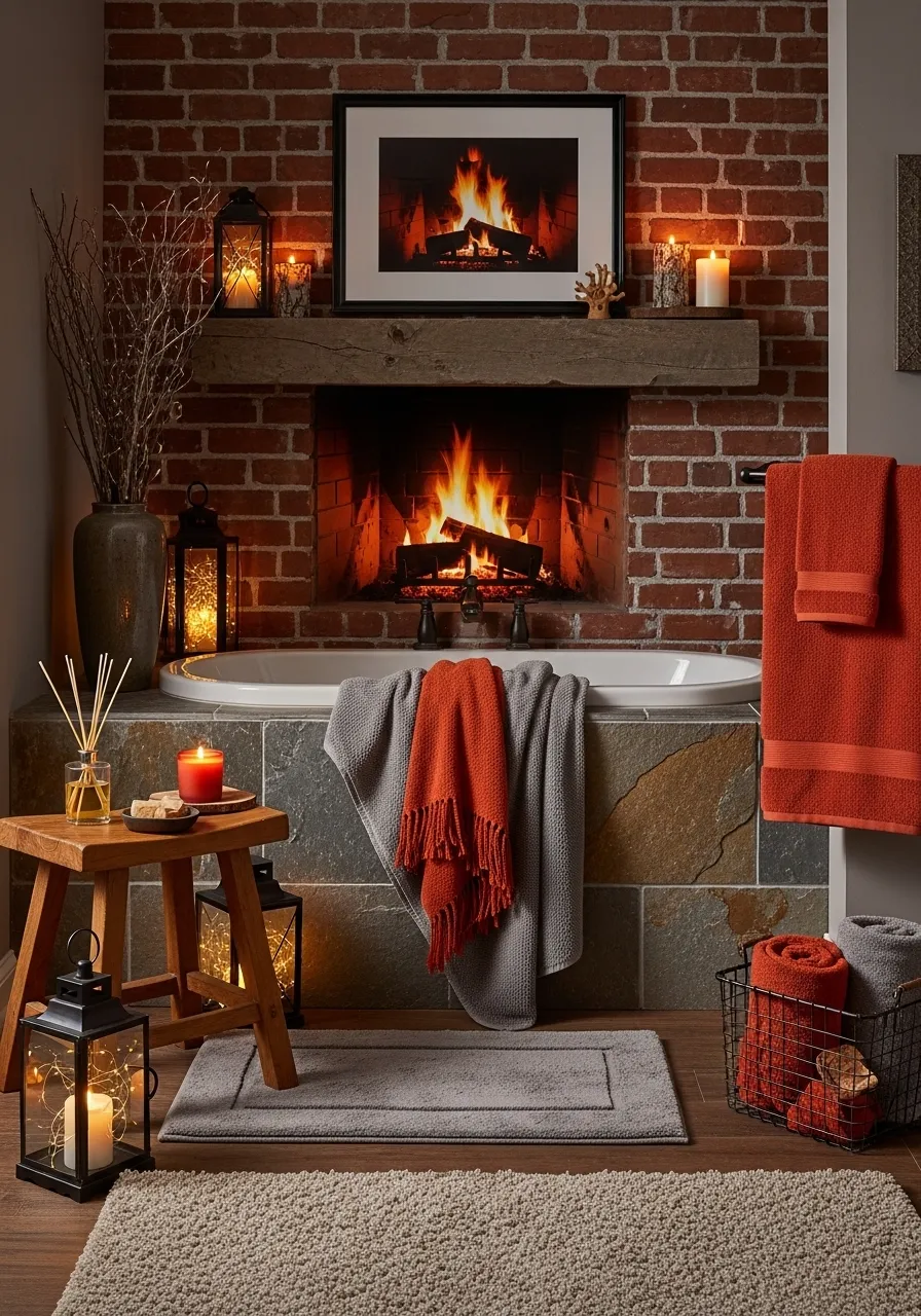 Create an unparalleled sense of warmth and coziness in your bathroom with the comforting presence of a fireplace. This unique space masterfully blends rustic brickwork with thoughtful fall accents, offering a truly inviting sanctuary. The crackling flames become a captivating focal point.
