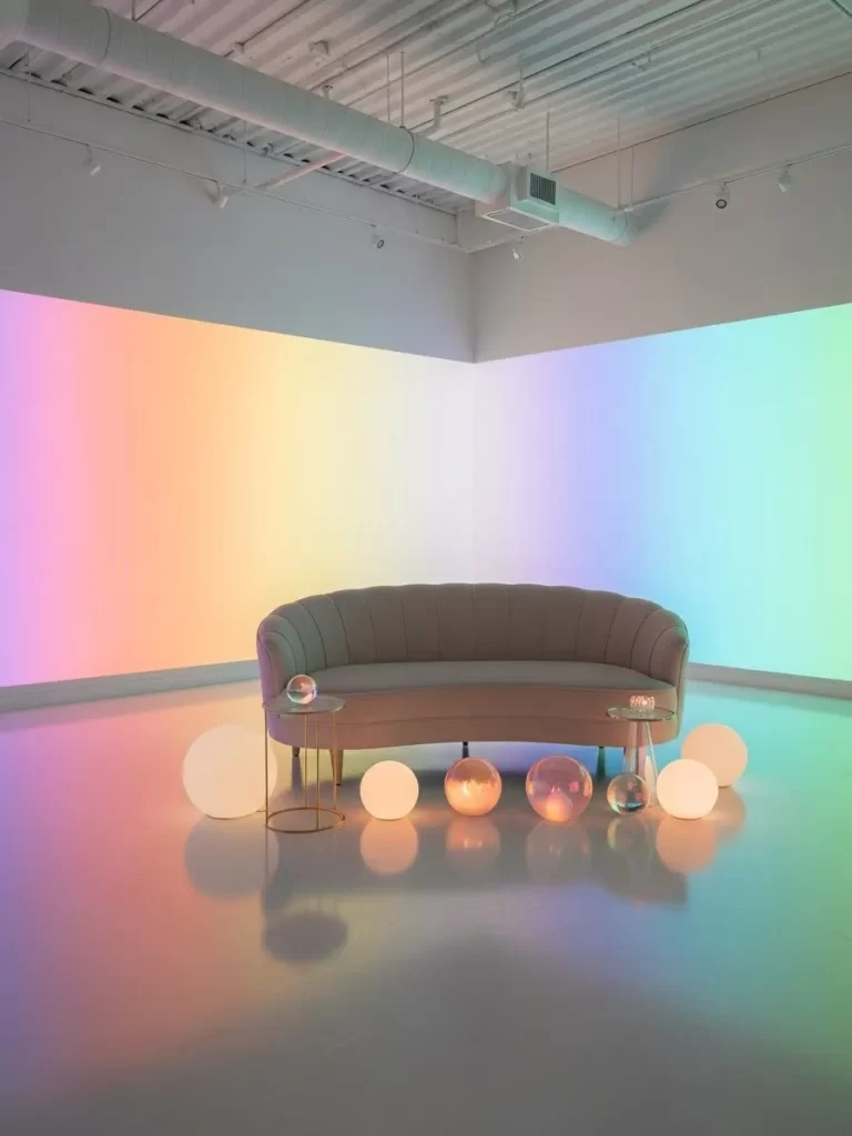 Transform your living room into a vibrant dreamscape with this breathtaking setup. Soft rainbow colors wash over the walls and create a magical atmosphere for your friends. A curved sofa sits at the center of this glowing oasis while inviting everyone to relax. Round floor lamps scatter warm light across the polished floor like fallen stars.