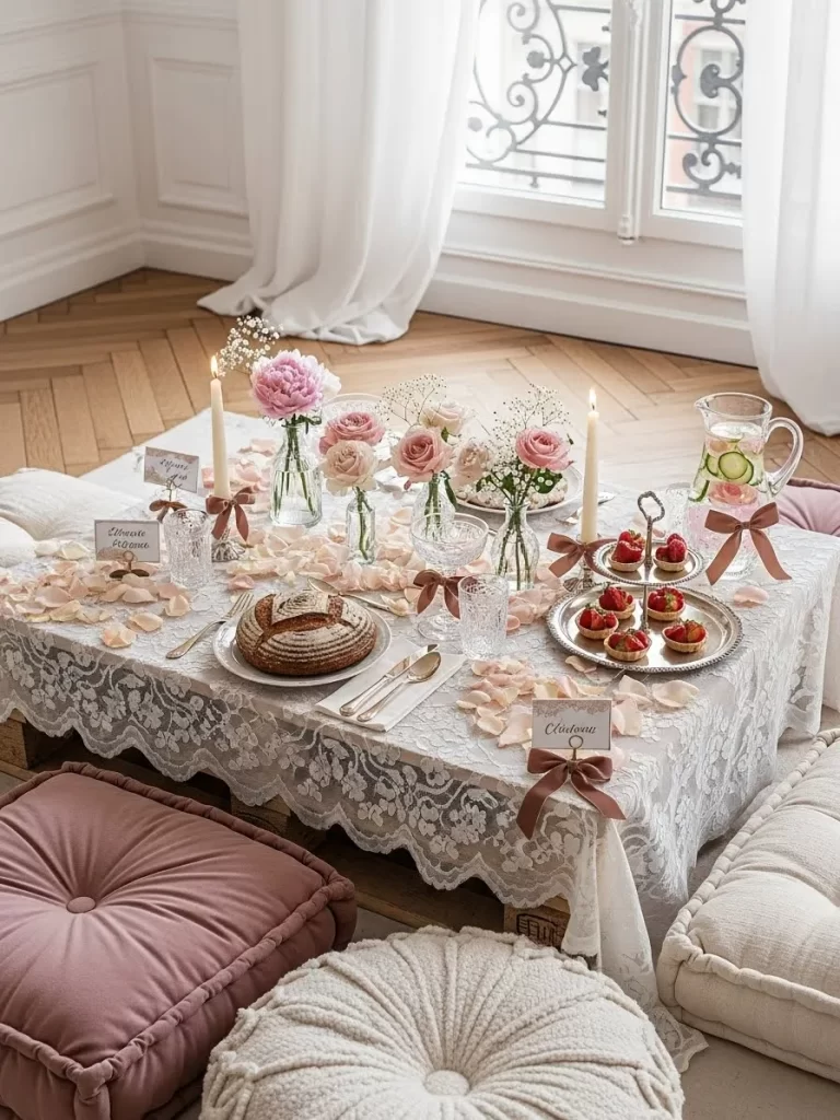 This style is cheerful and brings a youthful energy to your Galentine brunch. Your friends will enjoy the feminine details and the bright atmosphere. The mix of pink tones and mint green feels very modern and sweet. Large wall decorations like the bows make the room feel like a giant gift box. It is a fantastic backdrop for celebrating friendship and eating treats.