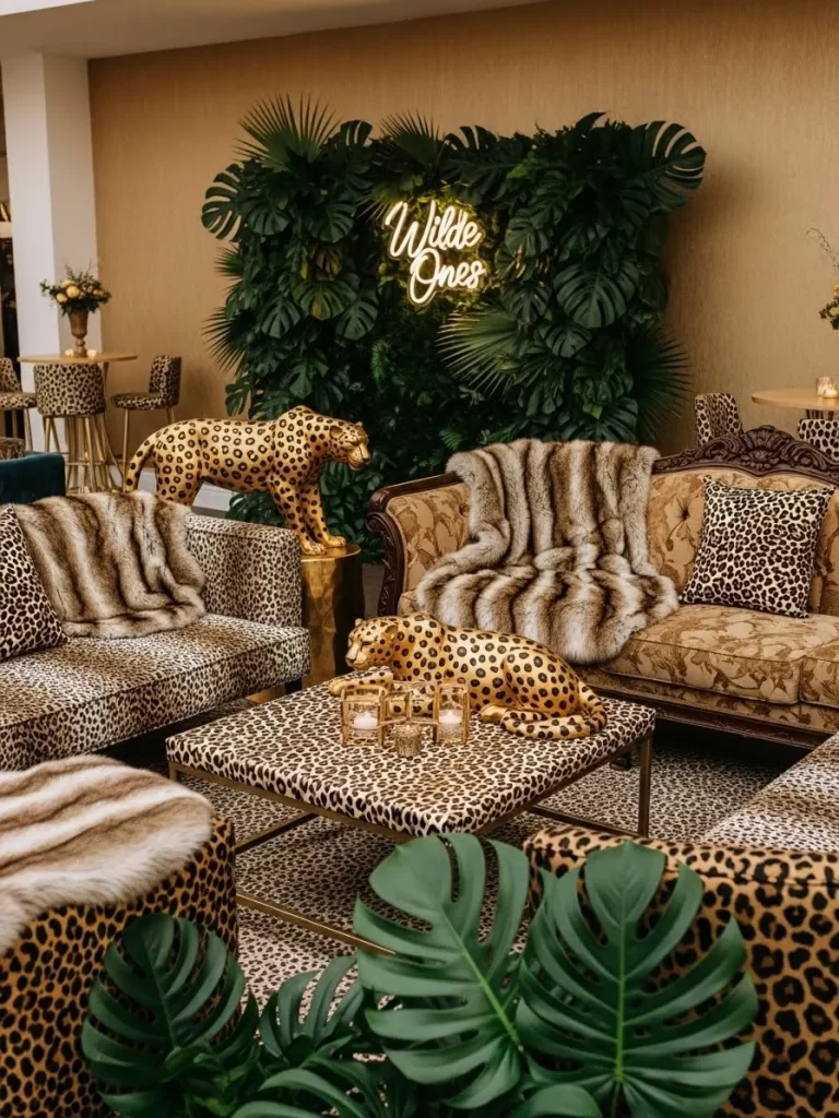 Release your wild side with a room covered in bold leopard prints and lush greenery. Faux fur throws drape over vintage sofas to provide a cozy and high end feel. Golden leopard statues stand guard near a large leaf backdrop with a neon sign. Thick monstera leaves add a tropical vibe that softens the striking patterns on the rug.