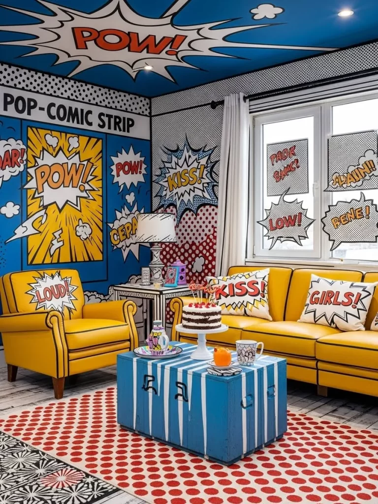Vibrant hues and bold shapes turn your dining room into a playful masterpiece. Two friends chat happily at a glass table supported by colorful geometric pillars. Neon squiggles hang from the ceiling while adding a modern glow to the festivities. Pink wavy frames and yellow chairs create a whimsical atmosphere that feels like a living art gallery.
