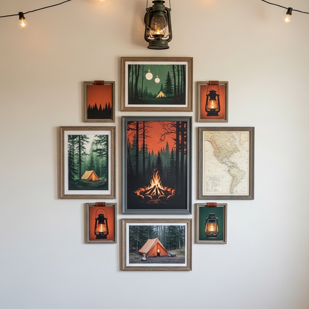 This gallery wall sparks nostalgia with its cozy, outdoorsy vibe. Centered around a glowing campfire, the arrangement features tents, lanterns, pine trees, and vintage maps that tell a story of wild summer nights.