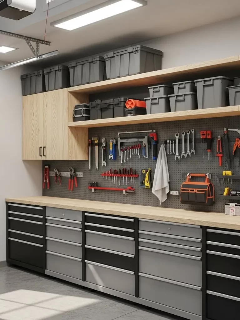 - Place your storage bins on the top shelves and organize your tools on the pegboard hooks.
