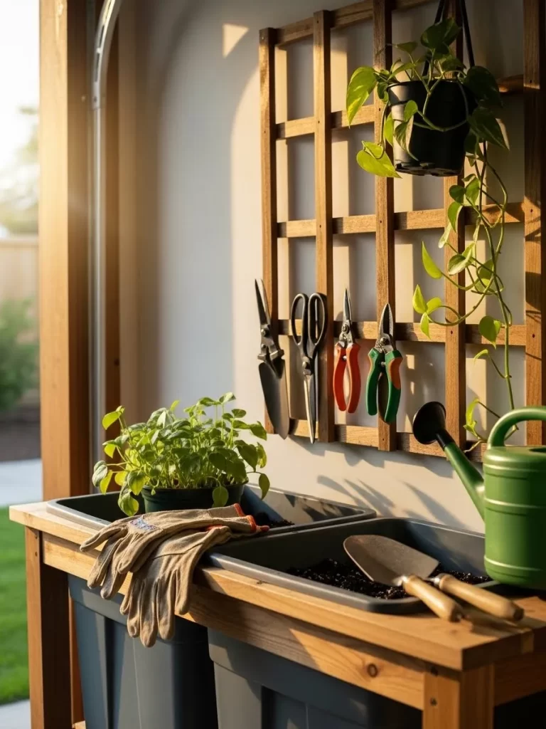 Large plastic bins often look messy sitting in the corner of your garage. This wooden screen hides your trash and recycling cans behind an attractive cedar fence. It creates a clean boundary while keeping your bins easy to access. The natural wood grain adds a touch of warmth to the utility area of your home.