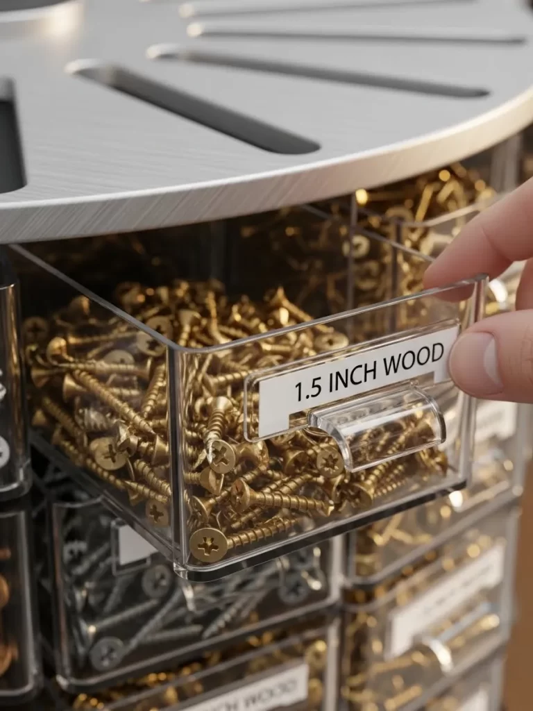 Clear plastic drawers make it easy to see exactly how many fasteners you have left. The wooden frame provides a strong and stable base for the rotating mechanism. This system is a dream for anyone who does a lot of assembly or repair work. You will never have to dig through a messy junk drawer again to find a screw.