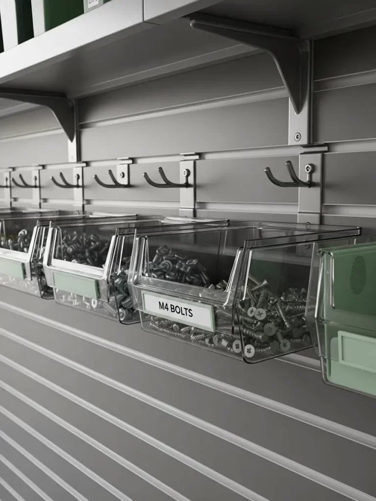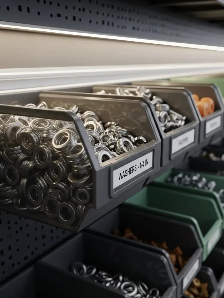 Detailed labels on each bin tell you the exact length and thread of the hardware. This prevents you from using the wrong fastener on a delicate project. The station can sit on any flat surface or even be mounted to a corner shelf. It is a grade solution for the most common type of garage clutter.