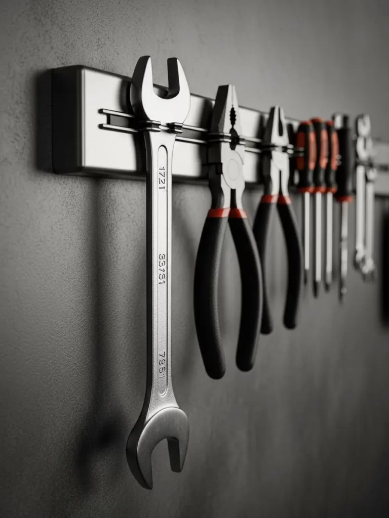 Knowing where a tool belongs saves a lot of time during a busy project. These black shadow outlines show exactly where each wrench and hammer should hang. You can see at a glance if something is missing from your collection. This system makes cleaning up your workspace much more efficient after a long day.