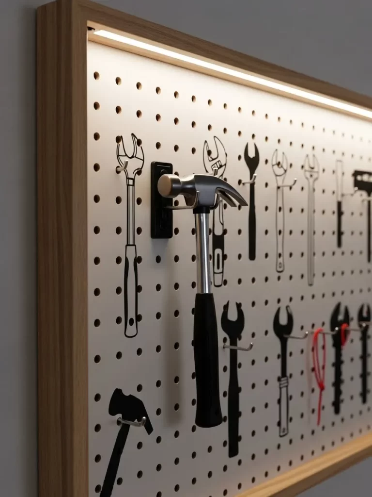 The wall above features a large pegboard system. You can hang your most used tools right in front of you. This keeps the work surface clear and ready for use. It also makes cleaning up much faster because every tool has a specific home.