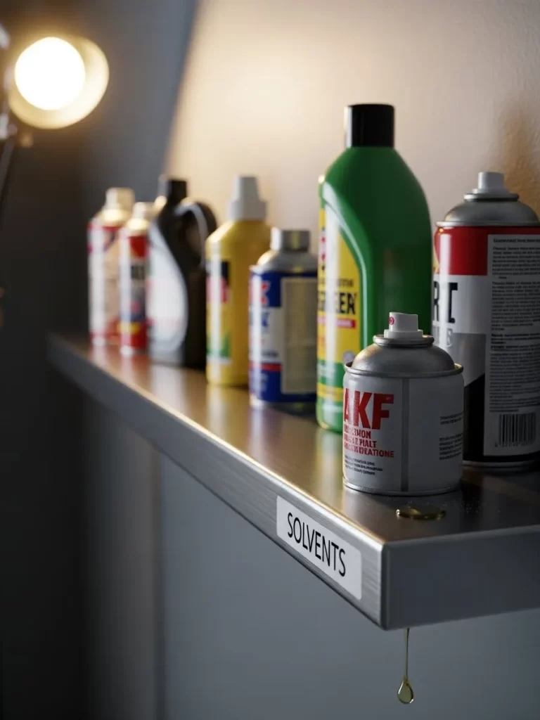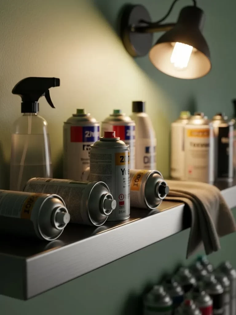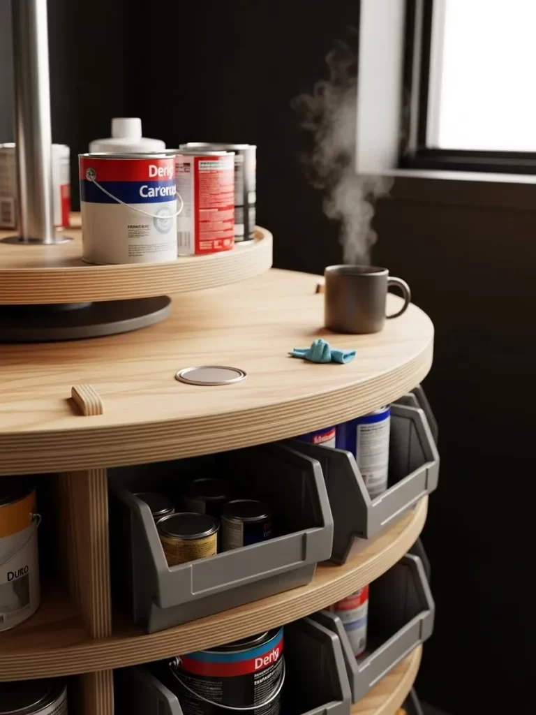 Multiple tiers provide separate spaces for cleaners, paints, and lubricants. The central wooden pillar provides a strong backbone for the entire structure. This design stops you from digging through rows of cans to find one specific color. You can see every label by just turning the unit.