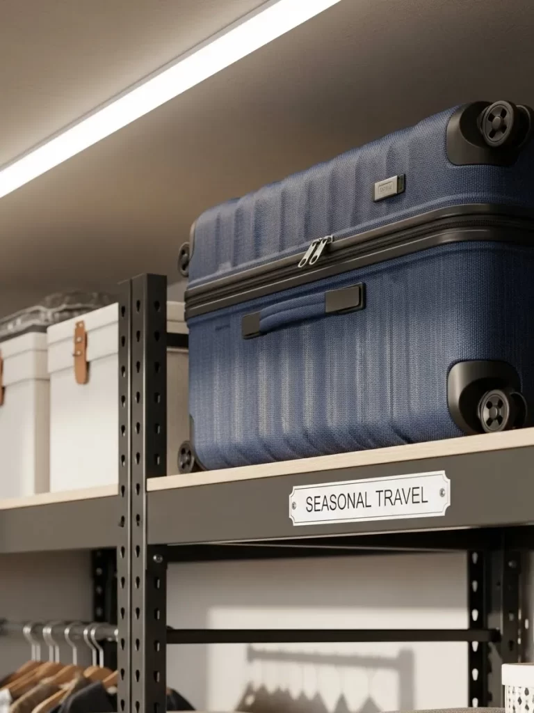 Suitcases take up a massive amount of room in your bedroom closets. This dedicated shelving unit keeps your heavy luggage high and out of the way. Sturdy metal frames support the weight of multiple bags without any bending. A clear label identifies the area specifically for your seasonal travel gear.