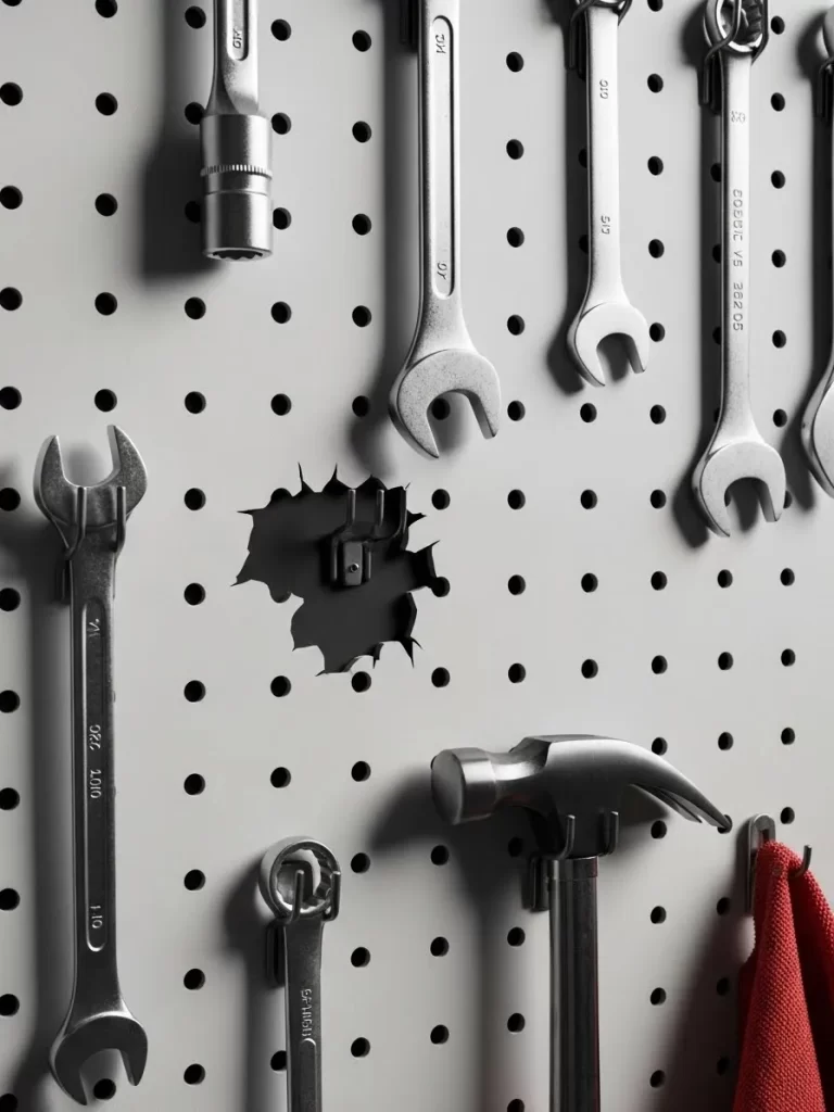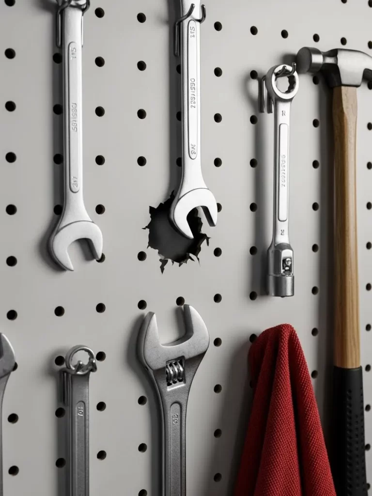 - Mount the pegboard panels to the wall studs above the bench. Use spacers behind the board so hooks can fit into the holes.