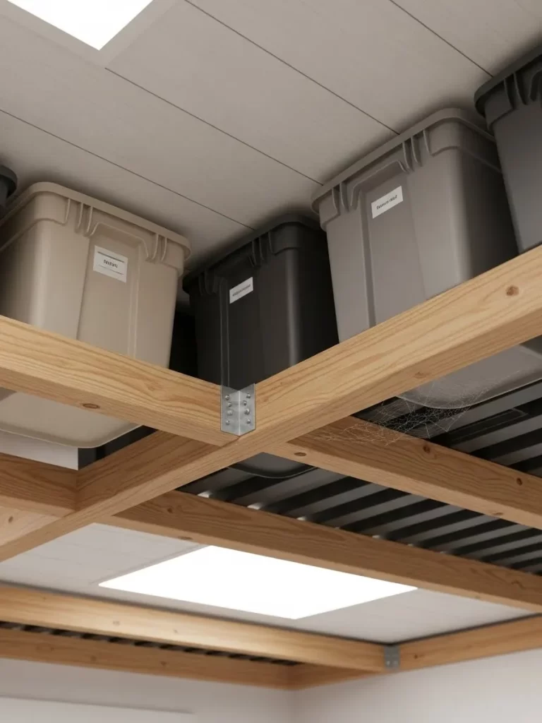 Your garage ceiling has a huge amount of hidden storage potential between the wooden beams. These wooden tracks allow you to slide plastic bins directly into the space between the joists. It keeps your belongings safe from the floor and maximizes your total square footage. This method is great for lightweight items and your holiday decor.