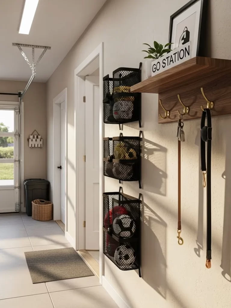 This station serves as the transition point between your home and the garage. It features wire baskets for sports balls and hooks for everyday essentials. Keeping keys and leashes near the door prevents frantic morning searches. The compact design fits on narrow wall sections near the entry.