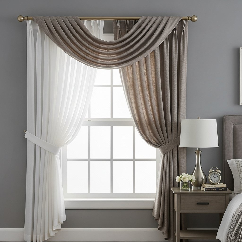 Grace and calm flow through this curtain arrangement. A warm taupe swag cascades over soft white sheers, blending gentle light control with elegant form.