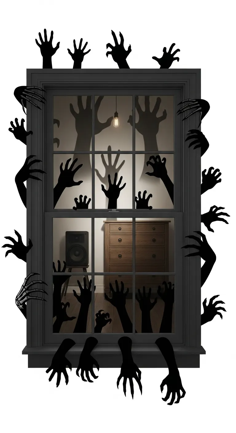 A tall, ominous figure stands motionless in the window, casting a long, eerie shadow. A wide-brimmed hat conceals its face in darkness. The creature’s gaunt, claw-like hands suggest a sinister presence.