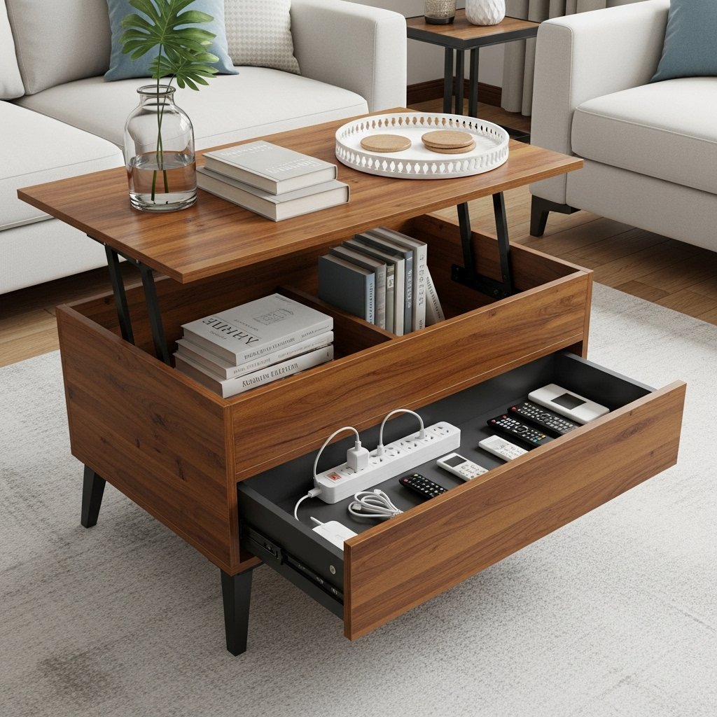This versatile coffee table offers both a rising tabletop and hidden storage. Its rich wooden finish adds warmth to the living room. The top lifts to reveal compartments for books, while a lower drawer slides out.