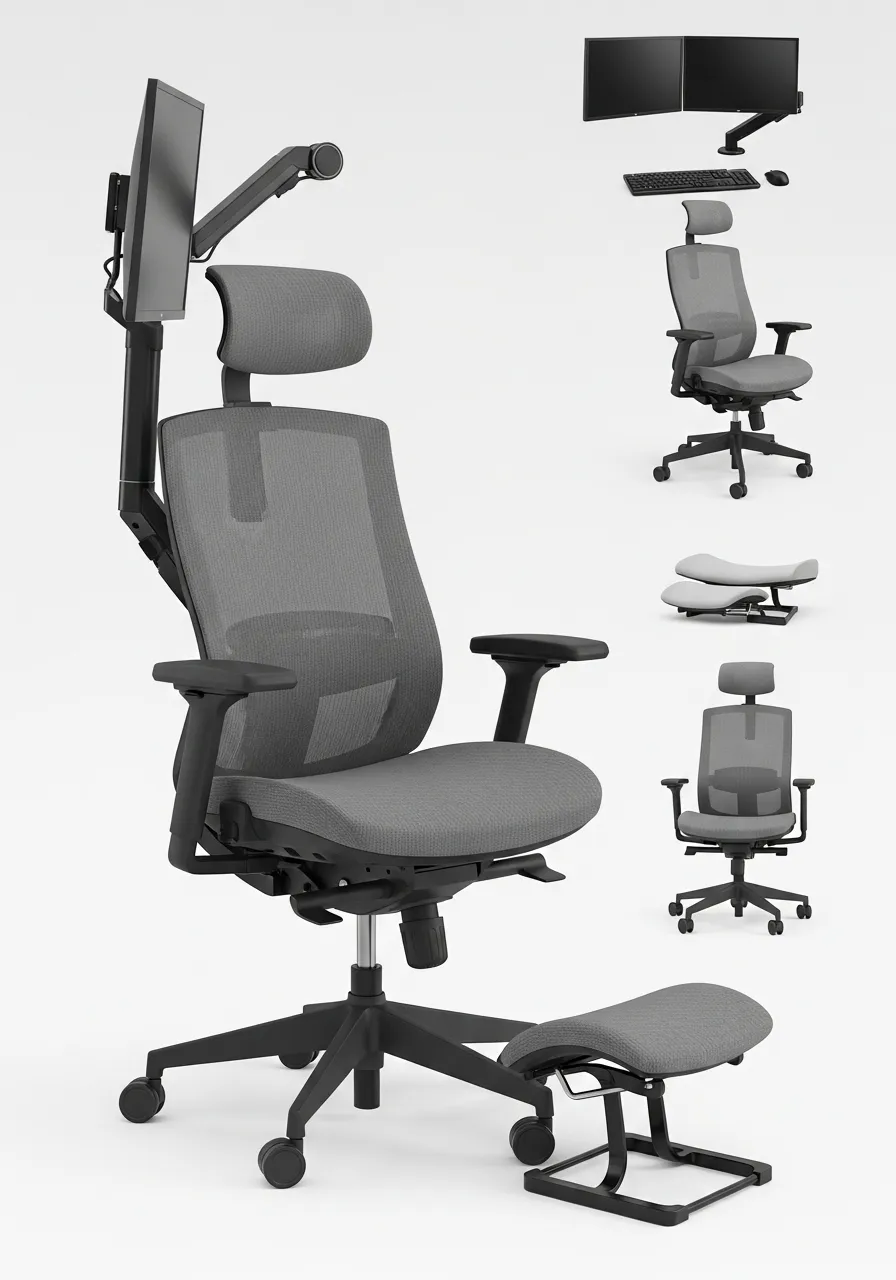 This comprehensive ergonomic chair transforms your home office into a fully integrated workstation. Its thoughtful design includes a monitor arm, keyboard tray, and an adjustable footrest, creating a seamless work experience. This chair offers ultimate adaptability for diverse tasks.