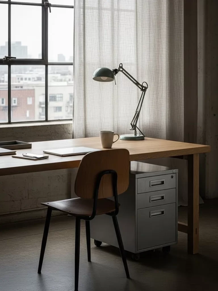 A clean wooden desk sits near a large window to invite natural light into your daily routine. This setup uses a metal filing cabinet on wheels to keep documents tucked away and out of sight. A vintage green task lamp provides focused lighting for late evening projects while keeping the surface clear of unnecessary bulk.