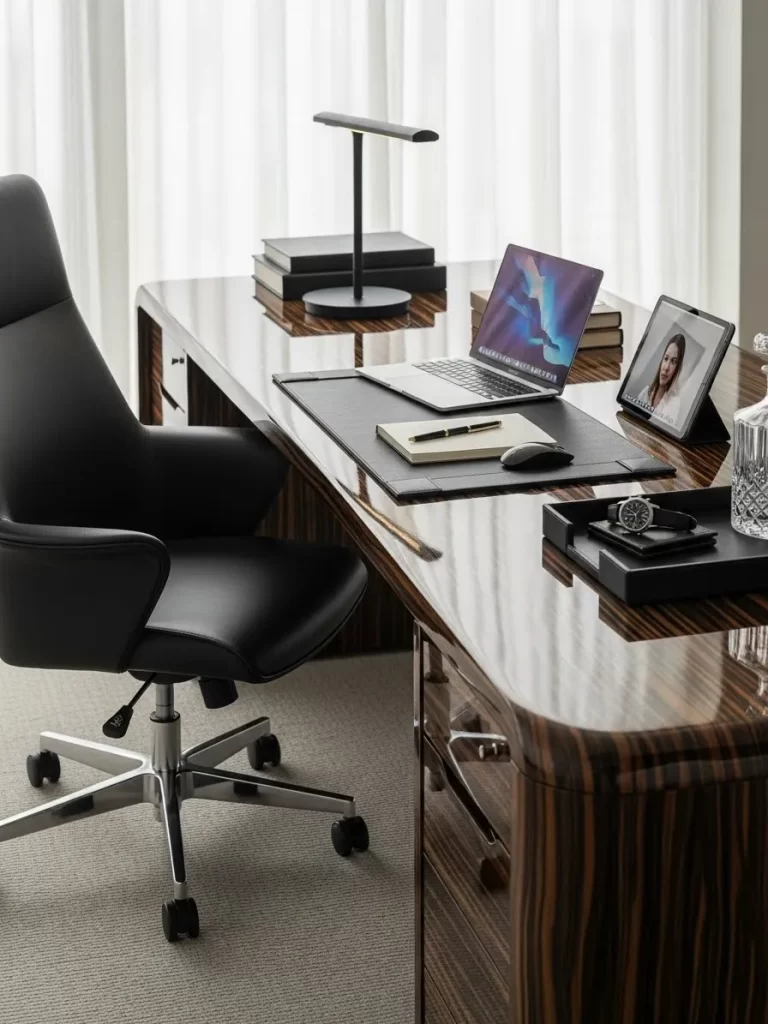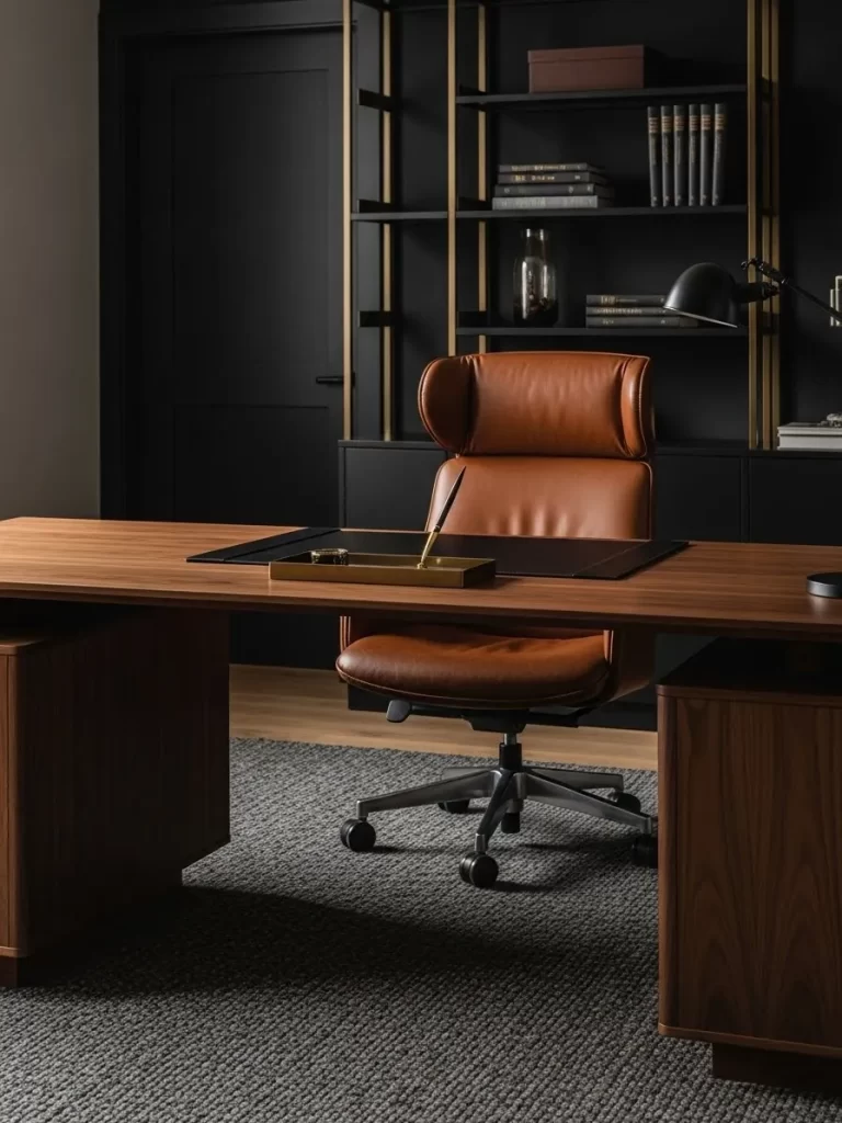 Comfort plays a huge role in staying focused during long afternoon meetings. The soft leather seat supports your back while the wide desk offers plenty of room for your laptop and papers. Keeping the floor clear with a textured rug helps the space feel organized and quiet.