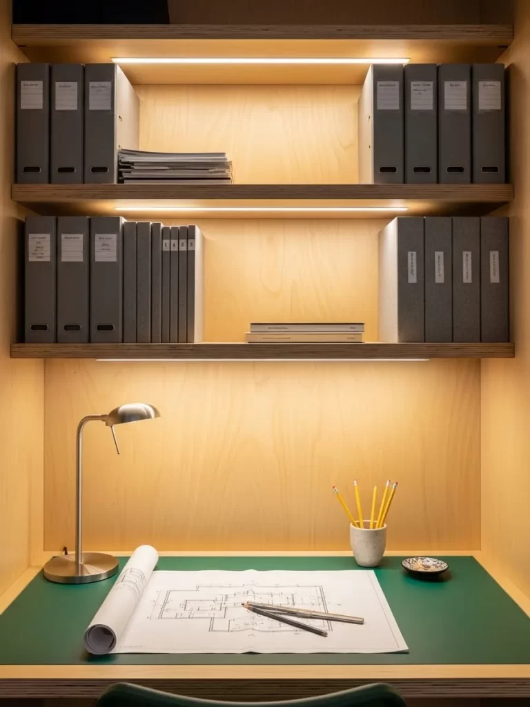 Warm LED strips hide under the wooden shelves to light up your blueprints and sketches. This small area uses a built in design to maximize every inch of the wall for storage. Grey boxes sit neatly on the upper levels to hold smaller tools and office supplies.