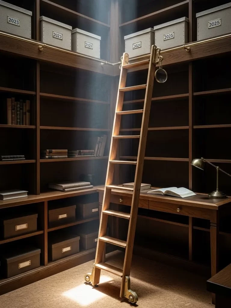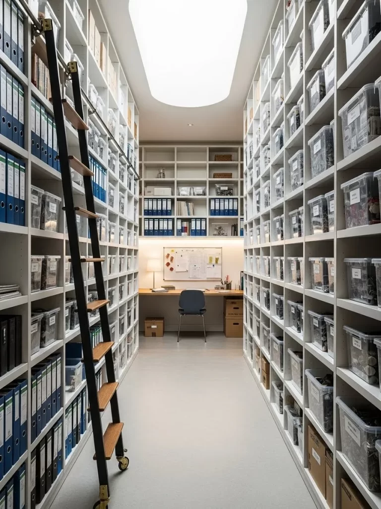 - Vertical storage on walls keeps your desk surface clear for active work.