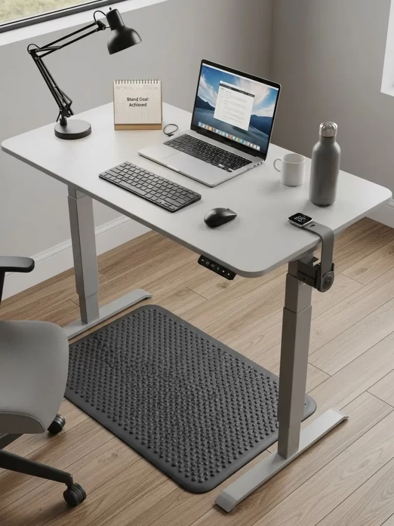 A grey standing desk allows you to change your position throughout the day to stay active. A bumpy black mat on the floor provides a soft and healthy surface for your feet. A silver laptop and a black lamp keep the setup looking clean and professional.