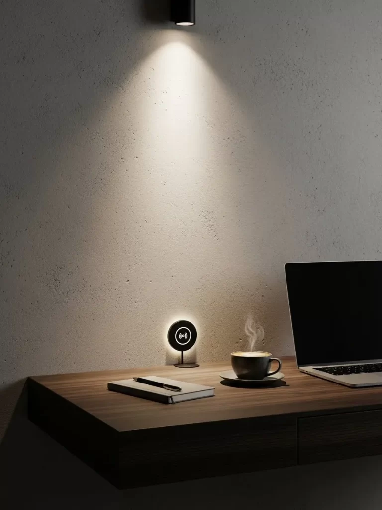 A thick wooden shelf floats on a textured wall and features a built in wireless charger. A small black light shines down from above to highlight your notebook and coffee cup. This minimalist design keeps your desk clear of messy wires and bulky lamps.
