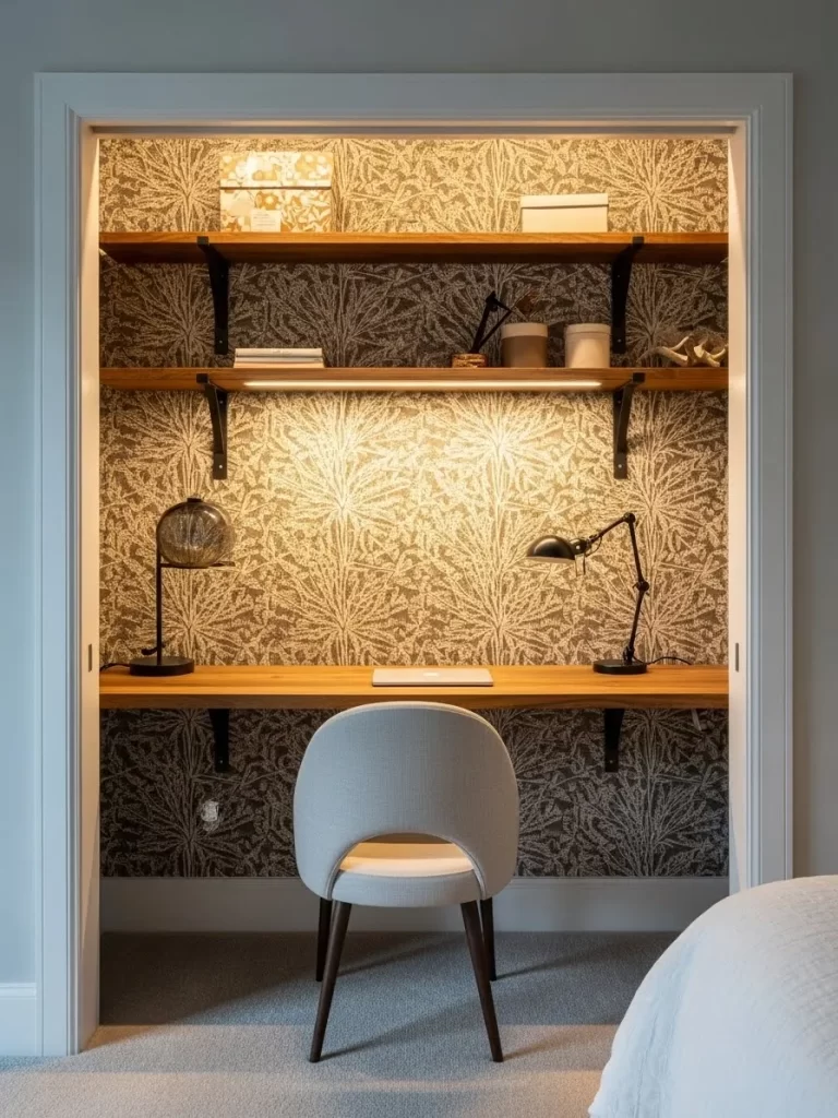 Floral wallpaper turns a standard closet into a secret place for productivity. Two thick floating shelves provide space for books and small decor items without cluttering the floor. A simple white chair fits easily under the narrow desk to save space when you finish your work.