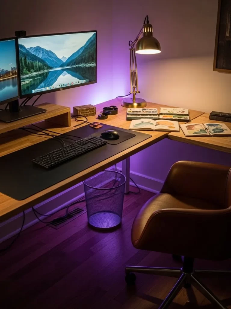 The corner position allows you to spread out your art books and computer gear at the same time. Using a riser for your screen helps keep your neck straight while you type. This setup is excellent for anyone who works with both digital and physical tools.