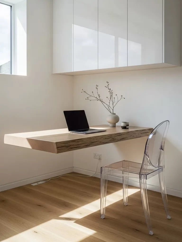 The wireless charger glowing on the wall makes it easy to power your phone while you work. Using a floating shelf removes the need for legs that take up floor space. It is a smart and stylish solution for a small and modern home office.