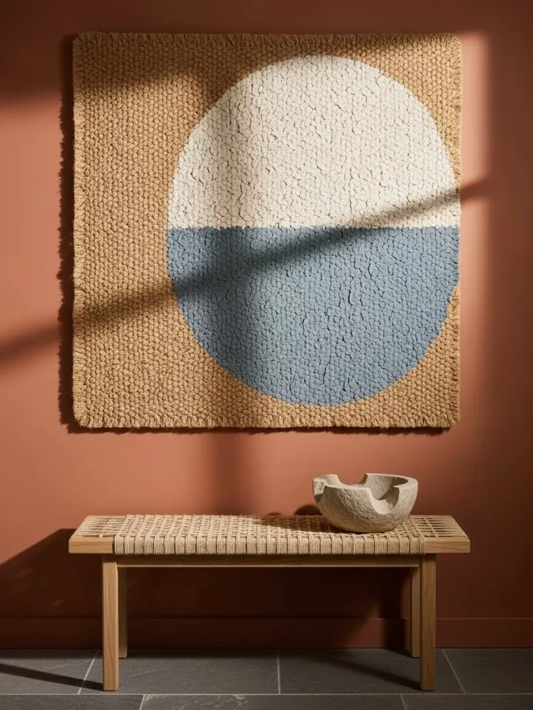 Soften your space with a large woven wall hanging or a textured rug. This approach adds depth and warmth to a bedroom wall. Using a metal rod with leather loops creates a high end look that feels very intentional.