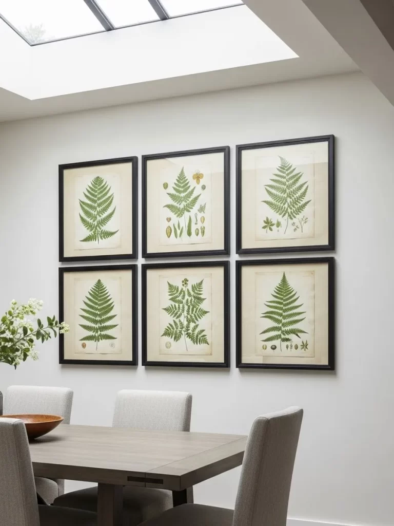 Grouped art creates a massive visual impact. It fills the space better than one small piece ever could. You can use black frames to make the green colors of the ferns stand out against a white wall.