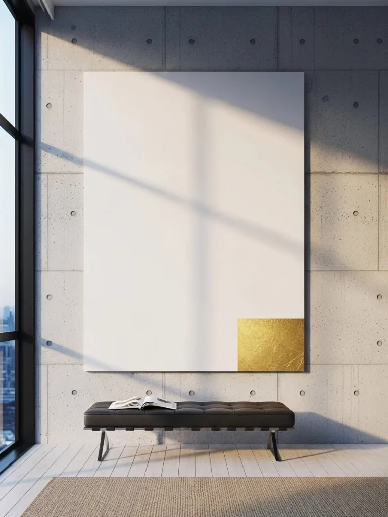 Modern art often focuses on a single bold detail to make a statement. This enormous white canvas features a small square of gold leaf in the bottom corner. It looks very sophisticated in a room with concrete walls or industrial furniture.