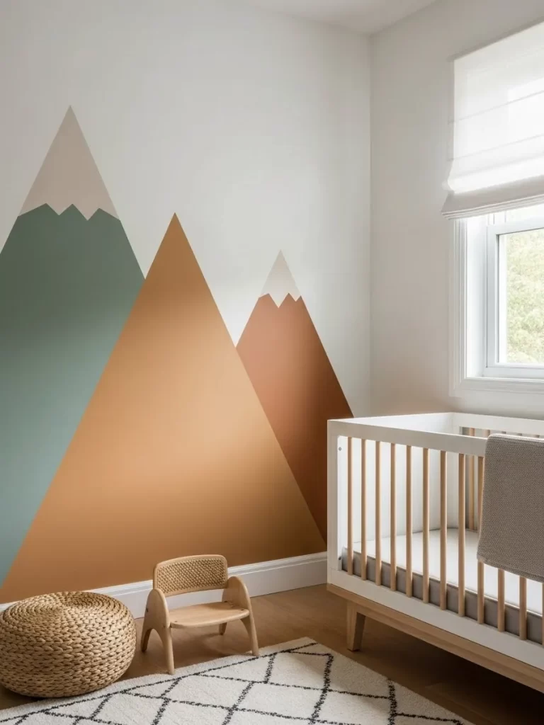 Transform a nursery into an adventure with a simple mountain mural. This design uses earthy tones like green and ochre to create a calming landscape. Painting shapes directly on the wall is an easy way to decorate a large area.
