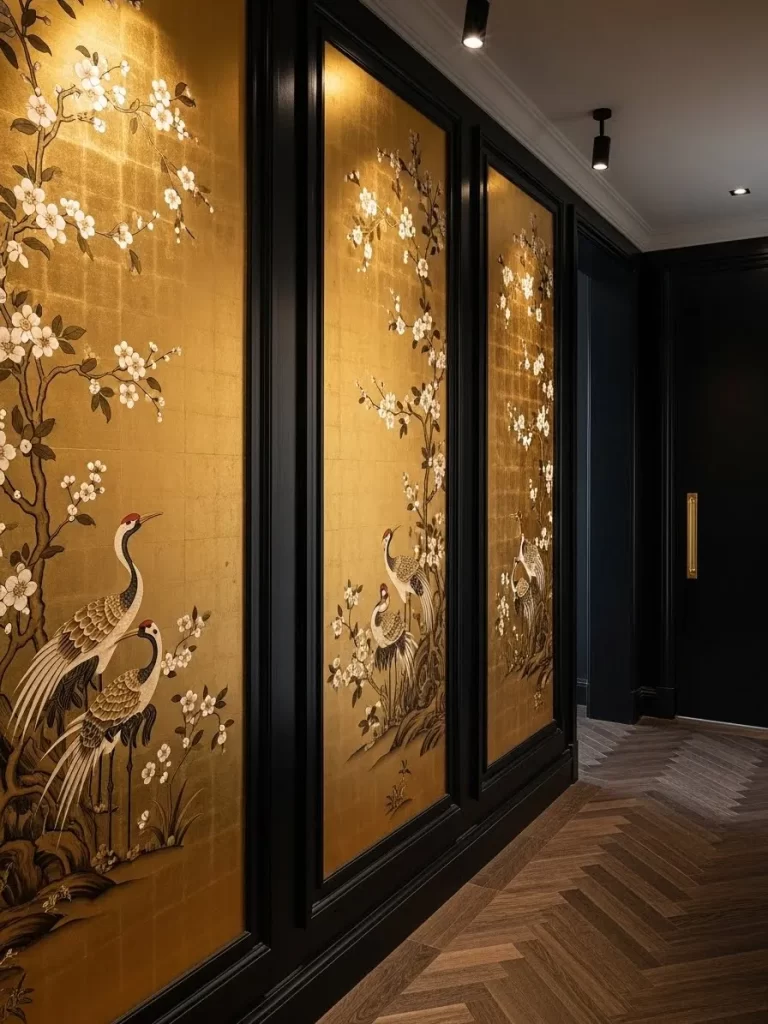 You do not need any painting skills to create this high end look. The contrast between the plain white surface and the shiny gold is enough to impress. It fills a tall wall space without feeling cluttered or messy.