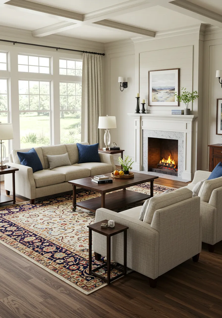 This inviting living room layout centers around warmth and conversation. A comfortable sofa faces a grand fireplace, creating an immediate sense of welcome. The neutral tones of the furniture allow the vibrant patterned rug to truly stand out, anchoring the entire space with its rich design.