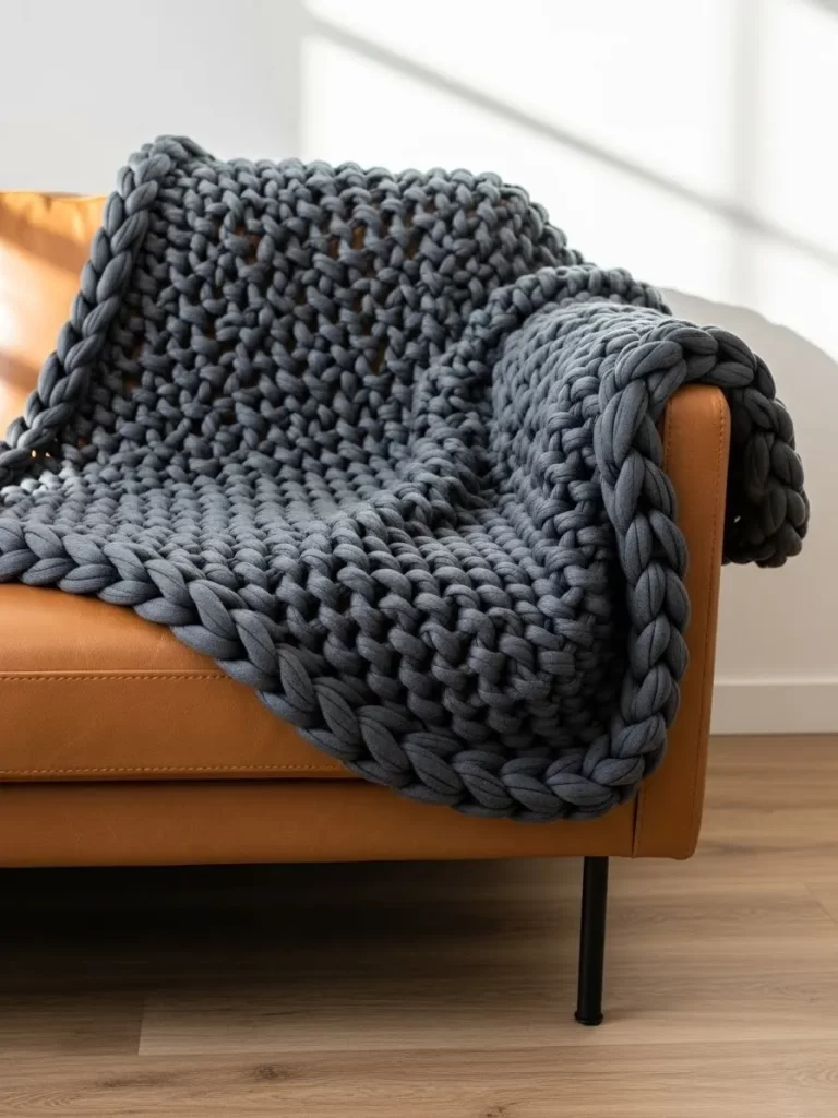 Darker textiles can add a much-needed sense of drama and weight to a light-colored seating area. This charcoal gray chunky knit blanket provides a striking contrast when draped over a warm leather sofa. The oversized loops offer a modern, architectural texture that feels both cozy and sophisticated.