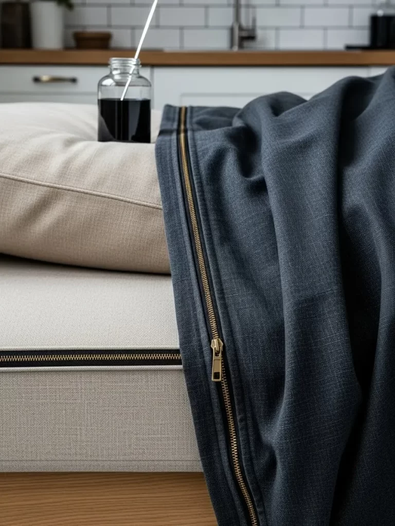 Breathe new life into a dated sofa by adding a custom slipcover with a bold contrast zipper. This design choice combines functionality with a sharp, industrial aesthetic. The exposed gold or brass teeth act as a decorative element against deep navy or charcoal fabrics.