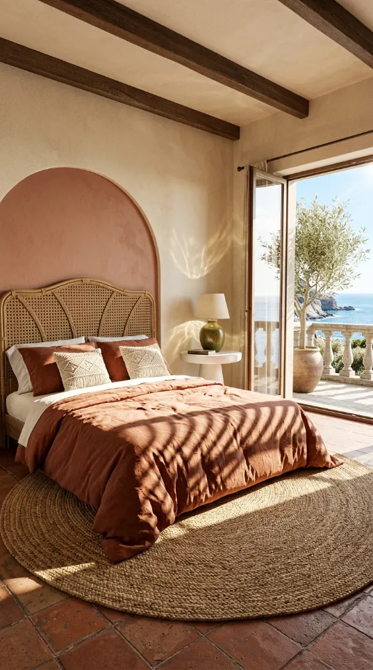 Warm clay tones bring a grounded feel to this retreat. A hand painted arch serves as a soft backdrop for the textured headboard. This design creates a focal point without the need for expensive structural changes. Natural light from the balcony emphasizes the matte finish of the wall.