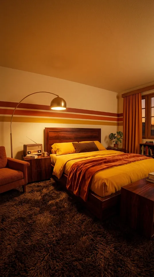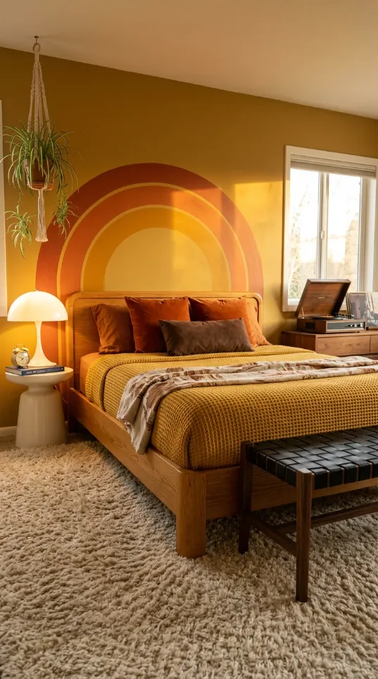 Warm shades of orange and mustard create a nostalgic atmosphere. A large rainbow arch sits directly behind the headboard for a bold effect. This color palette brings a sunny glow to the bedroom even on cloudy days. Waffle knit blankets and shag rugs add cozy textures that invite rest.
