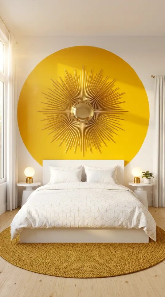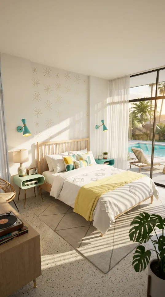 Transform your sleeping space with a striking focal point. This starburst accent wall captures the atomic age spirit without costing a fortune. Mint green paint provides a soft calming backdrop that makes the room feel airy. Gold decals or stencils add a touch of glamour and movement to the wall behind your bed.