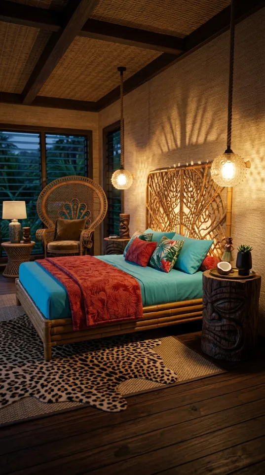Bamboo walls and a large peacock chair create a fun tiki inspired atmosphere. The bright blue bedding and red palm leaf blankets add a splash of tropical color. Carved wood nightstands and tiki masks bring a sense of history and island charm. This design is focused on fun textures and a vacation vibe.