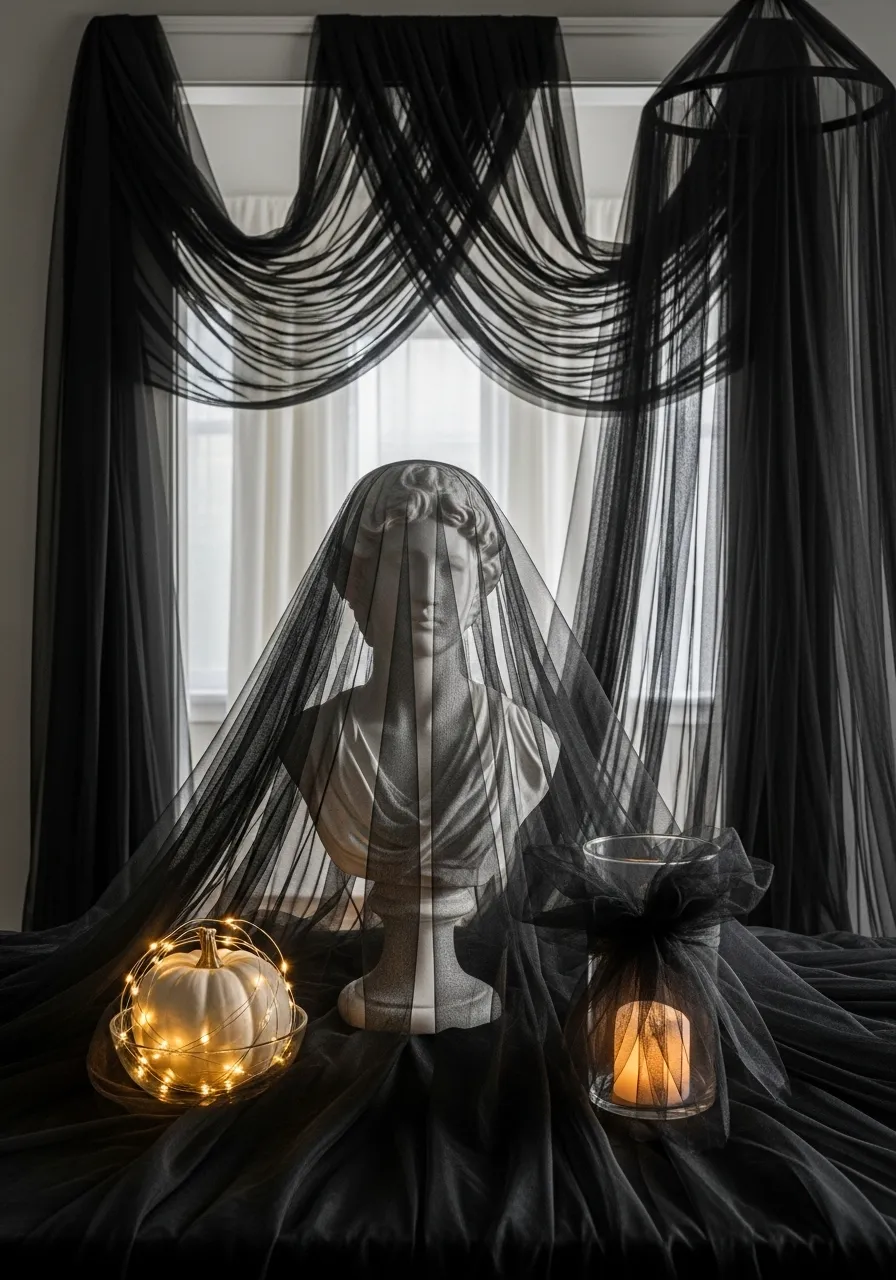 The scene is set with more flowing black fabric and soft, glowing lights. A small white pumpkin wrapped in fairy lights and a candle veiled in tulle add to the ethereal atmosphere. It’s an incredibly elegant and artistic way to create a haunting mood, relying on shadow and suggestion rather than overt scares.
