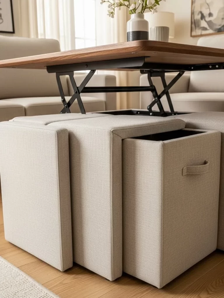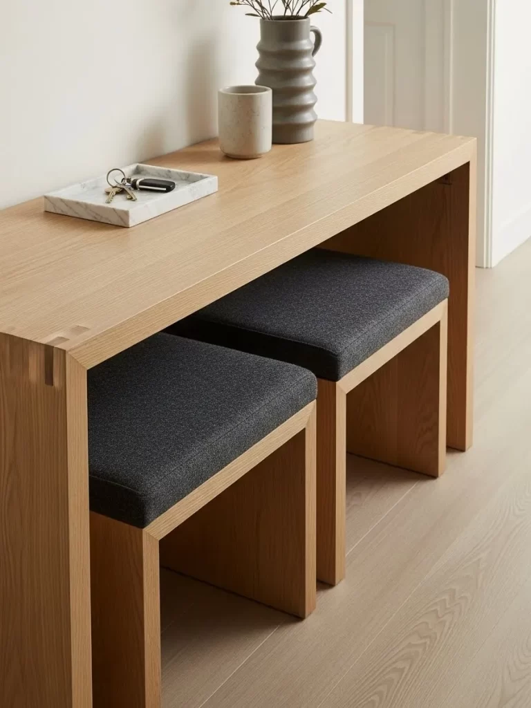 Small living rooms often struggle to provide enough seating for guests. This clever wood table solves that problem by hiding four upholstered stools within its base. You can pull the ottomans out when friends visit and slide them back to clear the floor later.