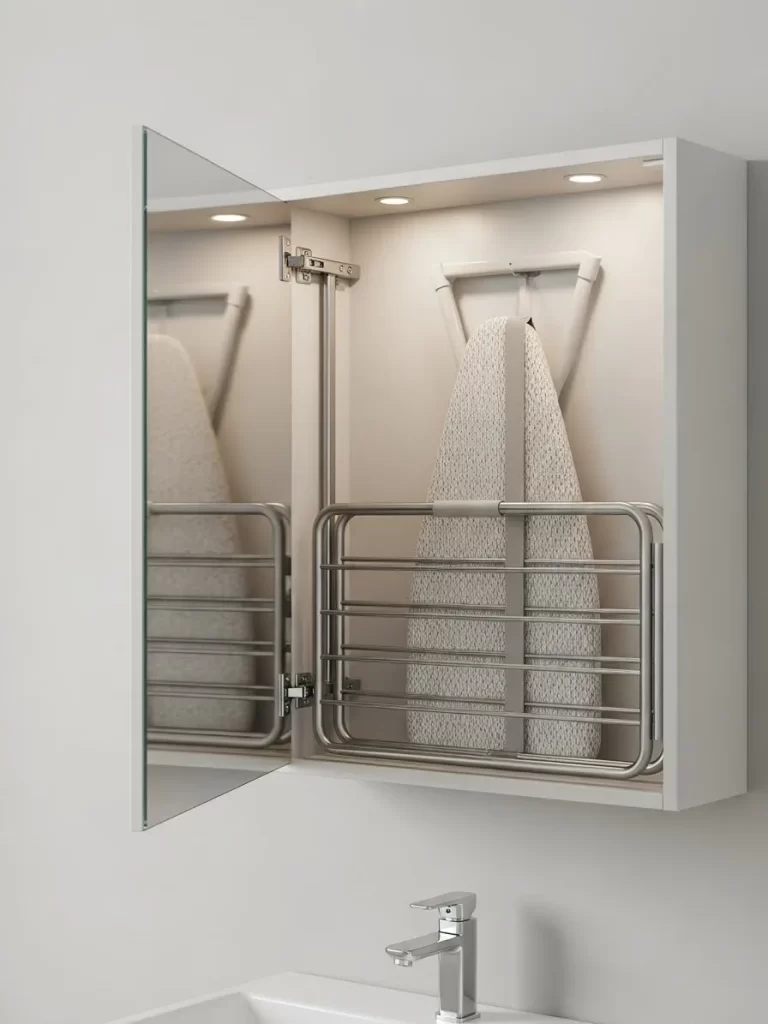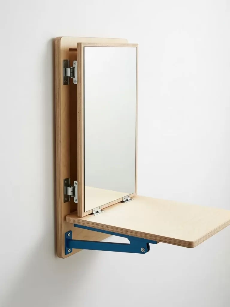 Floor space is a luxury in tiny bedrooms or narrow hallways. This wall mounted unit features a large mirror for your morning routine. A wooden panel below the mirror flips down to create an instant work surface.
