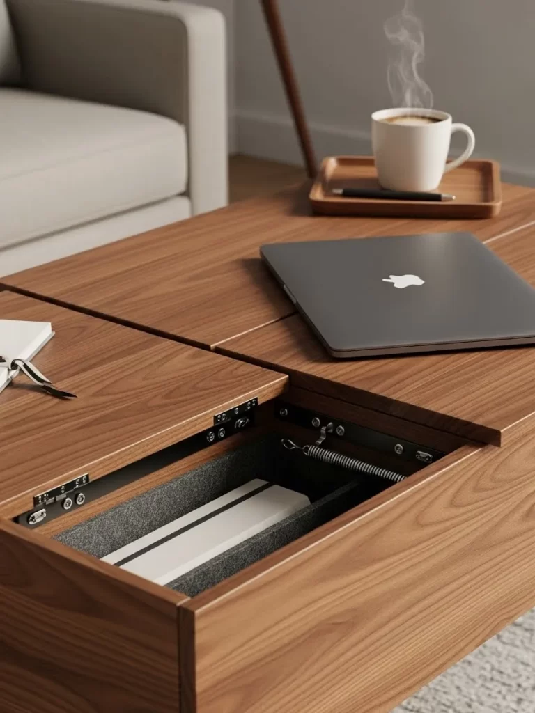 Extra storage space sits inside the main table body once you raise the top. You can keep remote controls or magazines tucked away to maintain a tidy look. This piece transforms a simple living area into a functional dining or office zone.