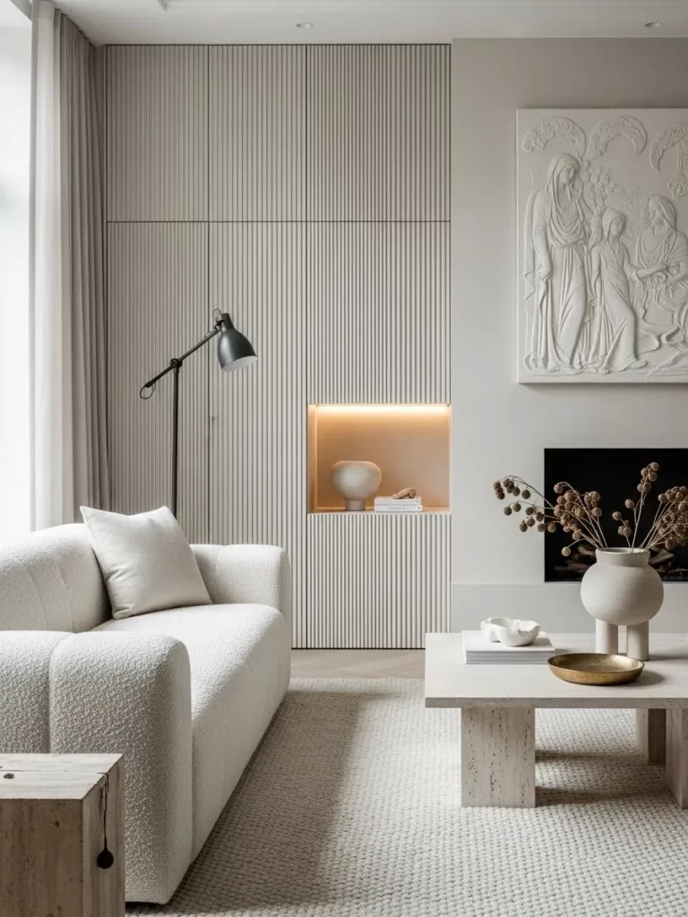 The fluted surface interacts beautifully with the natural light coming from the window. It complements the nubby boucle sofa and the smooth stone coffee table. Using subtle variations in finish ensures the monochrome look feels intentional and high end.