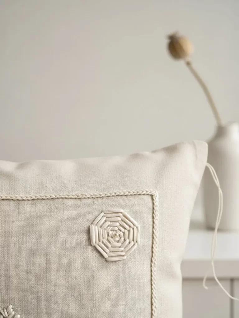 Small scale handiwork can make a room feel personal and high end. This linen pillow features a raised, geometric embroidery that adds a delicate 3D texture to the sofa. The neutral thread blends with the fabric, allowing the shadow of the stitches to create the pattern.