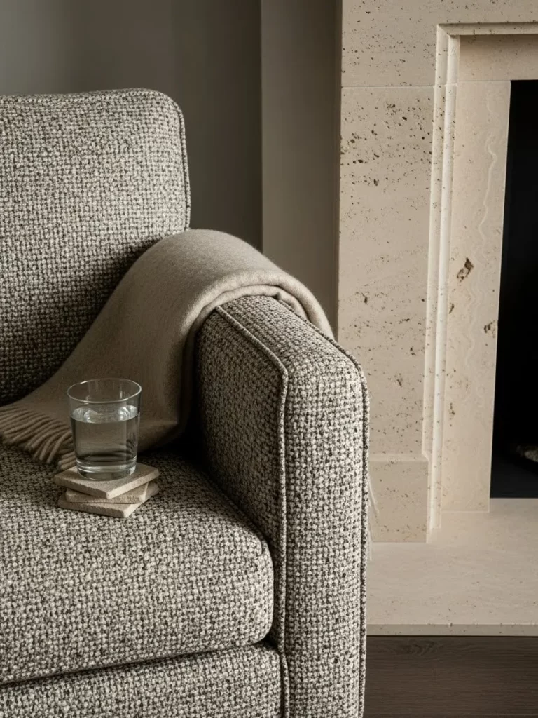 A soft cashmere throw draped over the armrest adds a final layer of tactile indulgence. A clear glass of water on stone coasters provides a sharp, clean contrast to the textured fabric. This combination is all about mixing hard architectural stone with soft cozy textiles.